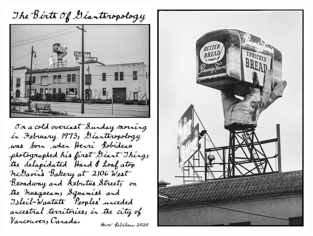 When Henri Robideau photographed the Giant Hand & Loaf in February 1973, its cuff had blown away in a wind storm and one of its fingers had rotted off. This image became the first in his life-long photographic study of humanity’s attraction to bigness, a new science he called Gianthropology. He conducted Gianthropological Digs along the Pacific cordillera throughout the 1970’s, culminating in the 1980 exhibition Giant Things, featuring the Giant Hand & Loaf as its signature image. Expanding on that huge success he launched the Pancanadienne Gianthropological Survey, portaging around Canada in the 1980’s, photographing the monumental in the form of panoramic images. After a dozen exhibitions of his panoramas, they were catastrophically destroyed in the Montreal flood of July 14, 1987. His lost work was later celebrated in the 1988 post deluge book Pacific To Atlantic, Canada’s Gigantic!