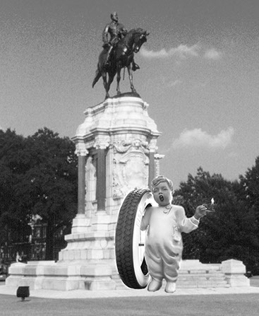 Those trips along the Atlantic seaboard were a festival of Giant Things and Burma Shave signs for the young Robideau, and in a time before highway rest stops, gas station wash rooms were the place to find relief. Especially popular were the gas stations with fiberglass Giant Fisk Tire Boys on the roof. The Giant Tire Boy was dressed in his P-J’s and held an enormous truck tire over one shoulder and in his other hand a lit candle, while deeply yawning, suggesting the company's pun slogan "Time To Retire." In 1955, following Hurricane Diane plowing through Richmond, Virginia, one of the Fisk Boys was blown across town and ended up at the foot of the Robert E Lee statue on Monument Avenue, sending a Gianthropological message to the looser of the Civil Slavery War statue that, nearly one hundred years after his defeat it was truly "Time To Retire" the slave trade and the racism it engendered.