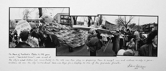 Colombe de la Paix Géant. The theme of Montreal's October 20, 1988, peace march- "War Is Not A Game" - was aimed at the city's school children and concentrated on the role war toys play in preparing them to accept war and violence as only a game. Children all over the city "surrendered" their war toys for a display on one of the parade floats.