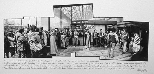 Haida singers outside the British Columbia Supreme Court celebrate the handing down of suspended sentences in an anti-logging case which saw their people charged with trespassing on their own land. The Haida have never agreed to relinquish their territory and are engaged in a continuing land claims dispute with federal and provincial governments. On the left their leader Miles Richardson gets swarmed by the media while on the right artist Robert Davidson, with drum in hand, directs the song. Vancouver, British Columbia, December 6, 1985.