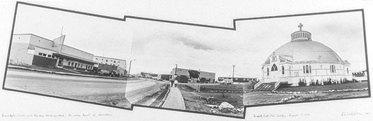 Giant Igloo Church and view down MacKenzie Road, the very heart of beautiful downtown Inuvik, N.W.T., August 11, 1981.