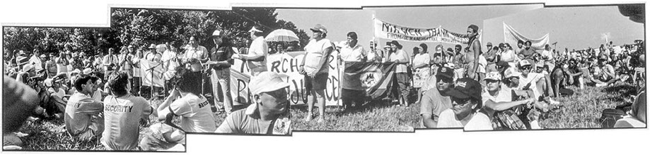 The best thing to come out of the decade of Pancanadienne Gianthropological Survey photography was the first thing I produced once I got my darkroom set up and running again – a new piece for the 500th anniversary of Indigenous resistance against colonialism, an eight panorama and sixteen single image narrative titled 500 Fun Years. Addressing the questions about Canada posed at the beginning of the project in 1981, 500 Fun Years examined the history and persistence of colonialism with documentation of current events highlighting the struggles of Indigenous Peoples to protect their lands and cultures from the capitalist interests of private property, resource extraction and the genocide of assimilation.
