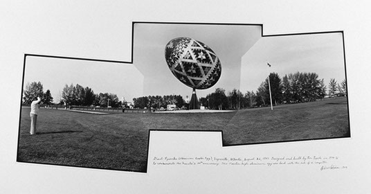 Giant Pysanka (Ukrainian Easter egg) Vegreville, Alberta, August 26, 1983. Designed and built by Ron Resch in 1974-76 to commemorate the Mounties 100th anniversary. This 10 meter high aluminum egg was laid with the aid of a computer.