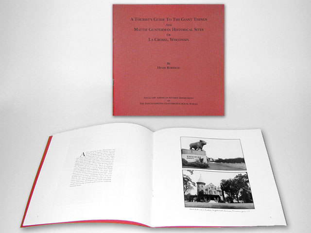 This booklet version of the 1978 photograph and text series A Tourist's Guide to the Giant Things and Mattie Gunterman Historical Sites of La Crosse, Wisconsin, harkens back to the early days of Gianthropology and crosses over to a prior research project on the life of early 20th century photographer Mattie Gunterman (1872-1945).