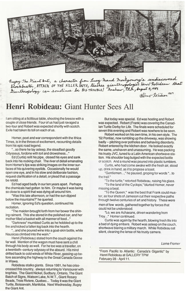 •Wood, Daniel. Henri Robideau: On the Road with Canada’s Foremost Gianthropologist. Canadian Art, 2:3. September 1985.