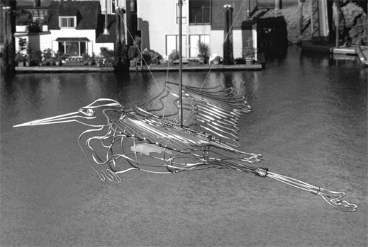 Khenko, the fisher, is the Coast Salish mythical name for the Great Blue Heron. Douglas Taylor’s Khenko was installed in Vancouver during the summer of 2006 on the north shore of False Creek directly across from Granville Island and just east of the Granville Street Bridge off the tip of George Wainborn Park. Khenko's wings flap up and down, powered by wind catching in its pivoting sails. There are even a couple of fish in Khenko's tummy. Khenko was unveiled to the public September 13, 2006.