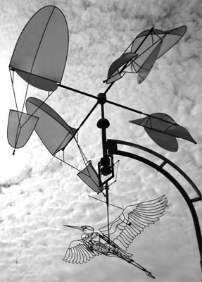 High tech fabricators and a team of engineers were required to render the spring from the artist’s model, and going from concept to successful final work was fraught with agonizing difficulty, Taylor noting, “Any one of these projects has the potential of being career ending.” The viewer sees none of this, only as Taylor says, “A continuously moving wind powered spring . . . clearly the metaphor embraces the risks involved in simply being alive, even if you’re a bug . . .” The Purple Martin was erected in December, 2004.