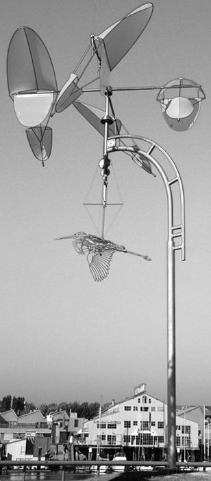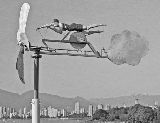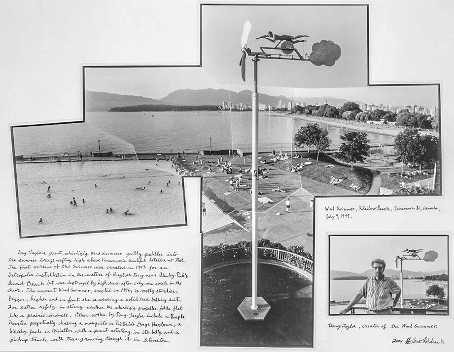The first version of the swimmer was created in 1993 for an Artropolis installation in the waters of English Bay near Stanley Park's Second Beach but was destroyed by high seas after only one week in the chuk. The current Wind Swimmer, erected in 1996, is vastly sturdier, bigger, higher and in fact she is wearing a solid lead bathing suit. For extra safety in stormy weather the whirligig propeller folds flat like a prairie windmill.