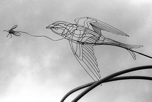 Even on the stormiest January day in the grey pit of winter Douglas Taylor’s whimsical sculpture of the Purple Martin chasing a bug can cheer you right up. A plaque at the base of the wire frame Giant Purple Martin reads: