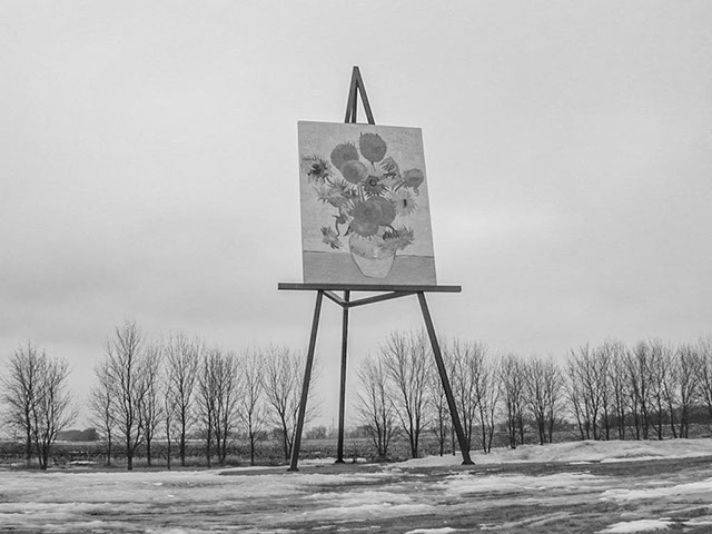 Giant reproduction of Vincent van Gogh's painting Sunflowers, Altona, Manitoba, March 28, 2001.